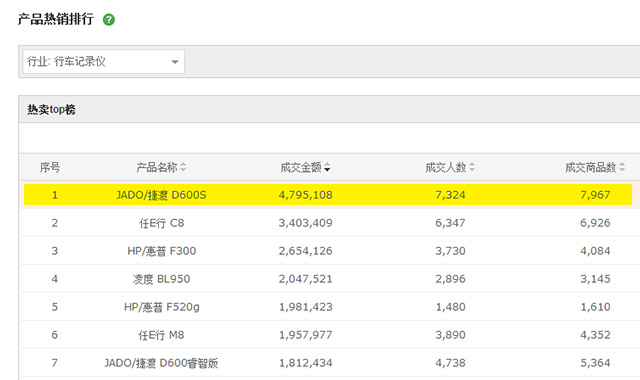 在天貓, 捷渡行車記錄儀產品熱銷排行第一 :