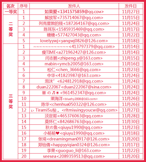 看到本公告后,未發送過個人詳細信息的中獎者,請于12月12日前把個人信息(真實姓名、詳細地址、聯系方式)發送至郵箱: cxy@china-jado.com ,以便我們能及時把獎品寄出,逾期未發送者視為放棄獎品。