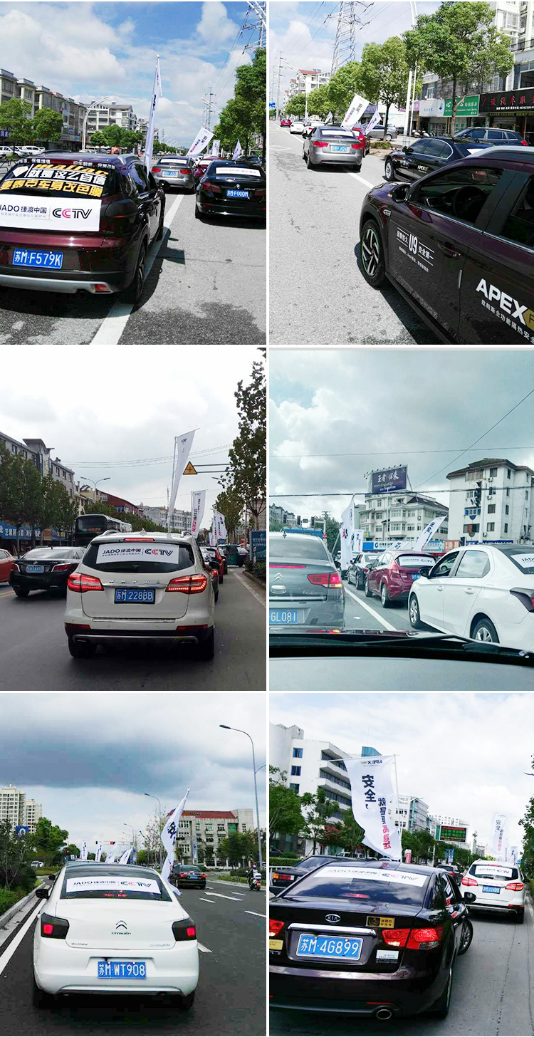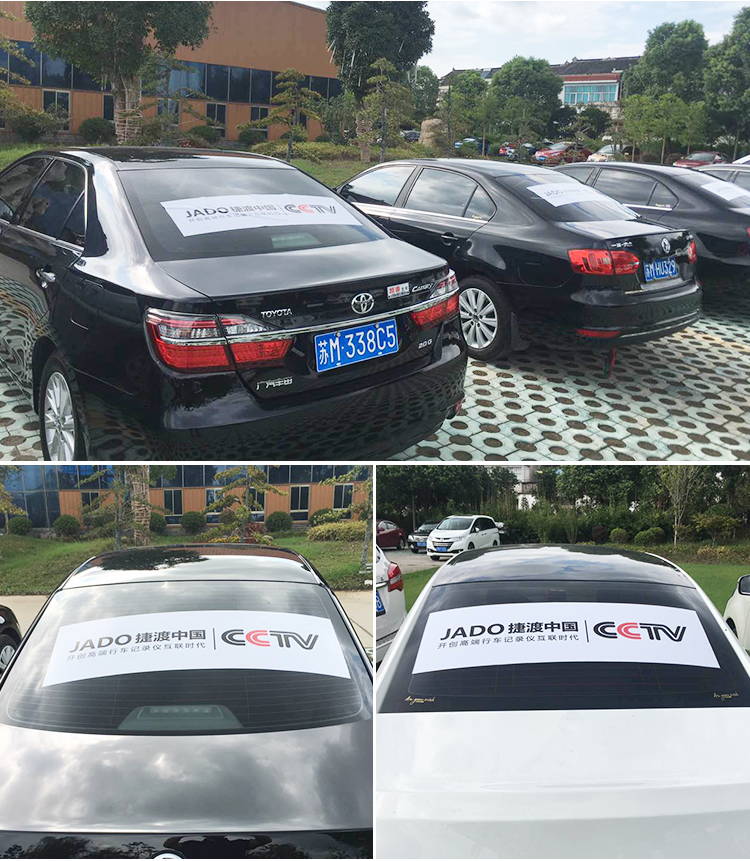 活動(dòng)開始前,在揚(yáng)州天泓汽車貿(mào)易有限公司所有工作人員的密切配合下,近110輛私家車的后擋風(fēng)玻璃貼上了“JADO捷渡中國(guó)|CCTV”鮮明字樣的單透,并與車主達(dá)成共識(shí):文明駕乘,注意行車安全。