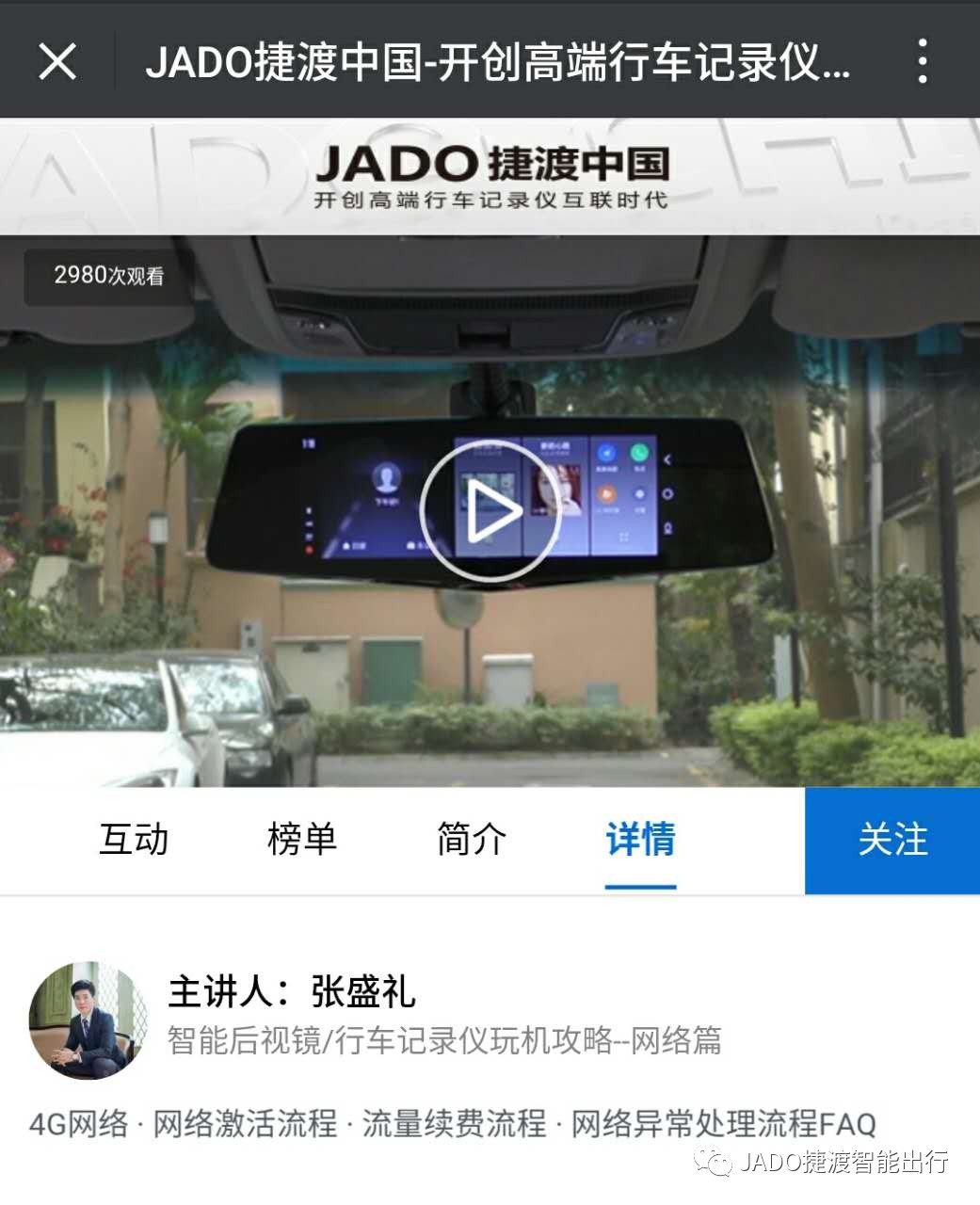 直播中,張盛禮先生就網絡注冊激活流程進行現場演示,使觀眾仿佛置身現場,對于JADO智能行車記錄儀的使用一目了然,更加得心應手。同時也針對使用中可能出現的微信公眾號二維碼加載失敗或者網絡異常的問題,進行措施處理的講解。