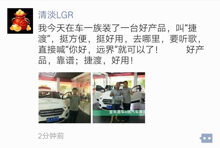 “我今天在車一族裝了一臺好產品,叫‘捷渡’,挺方便,挺好用,去哪里,要聽歌,直接喊‘你好,遠界’就可以了!好產品,靠譜;捷渡,好用!”一位車主在購買了之后,對此在朋友圈贊不絕口。