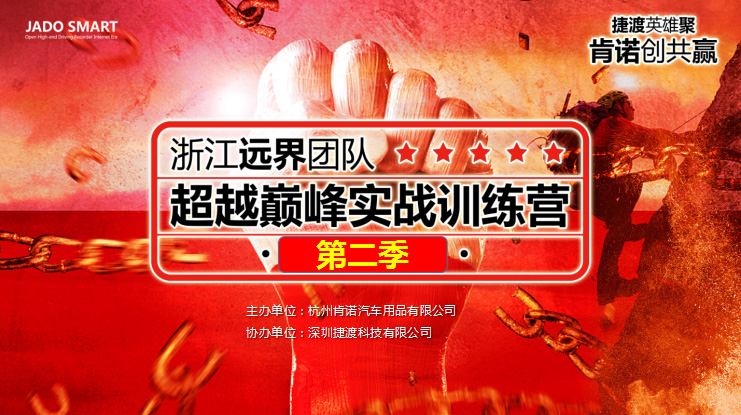 2017年9月12日,杭州肯諾汽車用品有限公司攜手JADO捷渡智能(中國),舉行了“捷渡英雄聚,肯諾創(chuàng)共贏”浙江遠界團隊超越巔峰實戰(zhàn)訓練營PK賽總結大會。JADO捷渡智能(中國)華東戰(zhàn)區(qū)總監(jiān)杜新先生、杭州肯諾汽車用品有限公司總經理徐善振先生,以及各優(yōu)秀終端門店店長參加了本次總結會。