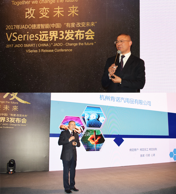 最后,杭州肯諾汽車用品有限公司副總經理徐成榮先生上臺為大家分享并總結了杭州肯諾遠界項目2017年的市場運營,并重點介紹了2018年的市場作戰計劃。發言中,徐成榮先生對JADO捷渡智能(中國)推出的產品給出了高度的認可。