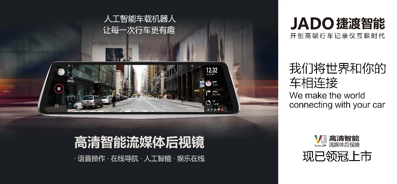匠心產品,打造領先行業的精品,JADO捷渡智能(中國)一直在路上。自凱迪拉克CT6推出流媒體后視鏡以來,寶馬i8 Mirrorless概念車也紛紛引入類似概念,流媒體成為當前熱點,市場上出現一批批流媒體汽車產品。但是目前流媒體后視鏡市場仍然比較混亂,行業尚沒有統一的標準規范。JADO捷渡智能(中國)強勢出擊,2017年率先推出了VSeries遠界3——超高清智能流媒體后視鏡,樹立了行業標桿,定義了行業記錄儀研發制造的高端水平。