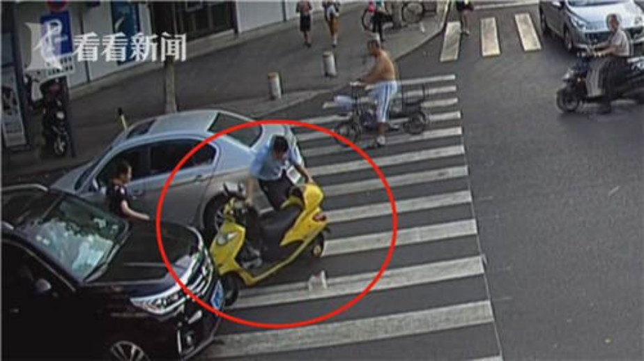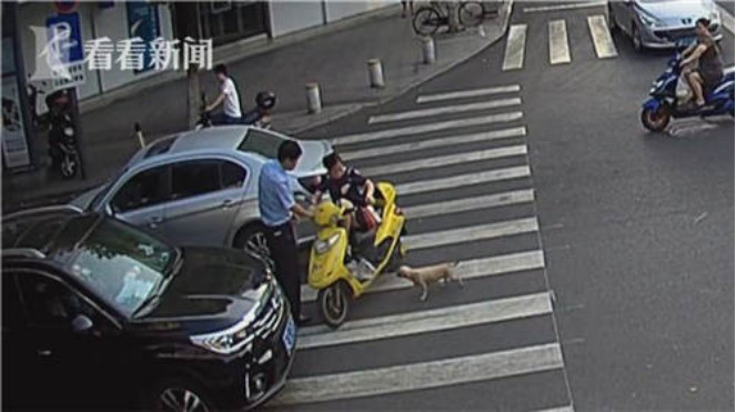 就這樣,因?yàn)橐粭l小狗的追逐,就接連發(fā)生了兩起事故,而張女士之所以這么怕狗,也是有原因的。當(dāng)時(shí)張女士剛剛從菜場(chǎng)買了一只鹽水鵝出來,這條小狗可能是被肉的香味所吸引,追著不放。“出來的時(shí)候就一直被一只狗追。因?yàn)槲沂窃袐D,我就怕被狗咬了以后不好。”驚慌之下,張女士才騎出幾十米就出了事故。