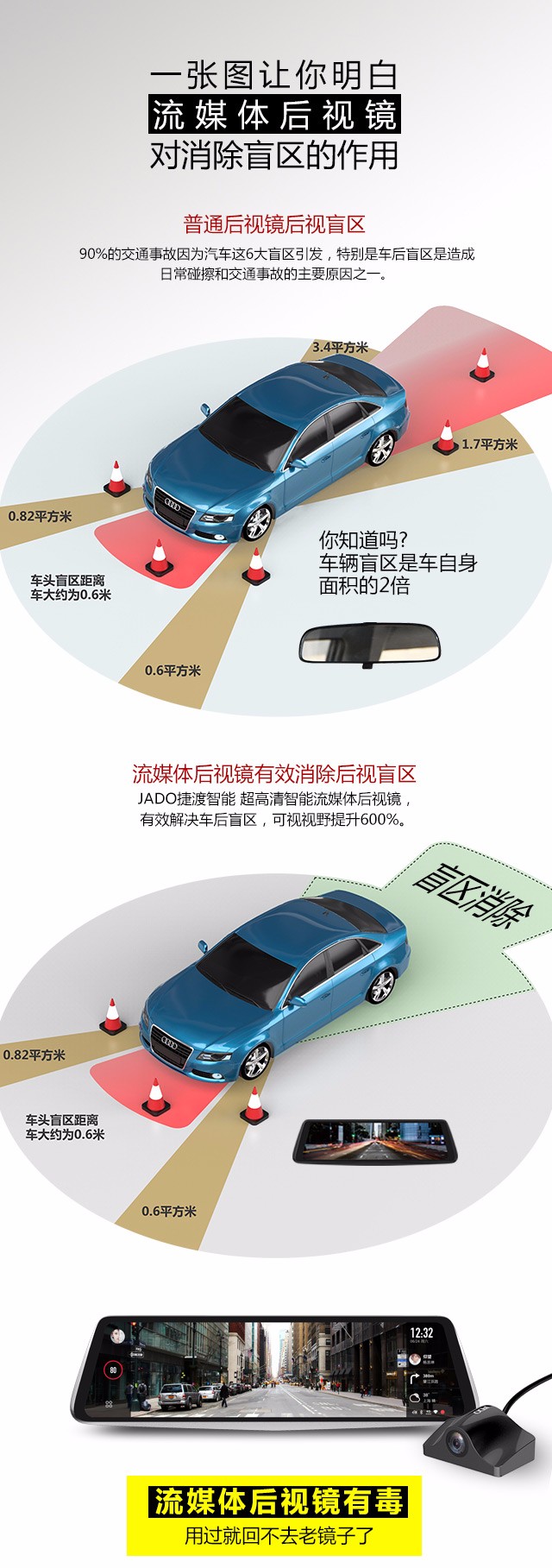 科技的進步推動了人工智能的發(fā)展,智慧出行的時代也悄然來臨。但無論在任何時代,“安全”都是出行時所要考慮的第一要素。對于駕駛員朋友而言,安全更是第一責任和要務。全球每年發(fā)生的交通事故,90%與駕駛員的視覺盲區(qū)有關。為了讓汽車出行變得更加的安全,JADO捷渡智能(中國)2017年在行業(yè)內率先推出了VSeries遠界——超高清智能流媒體后視鏡,仿佛讓駕駛員多了一雙“眼睛”,縮小了汽車后方的視野盲區(qū),讓顯示視野提升600%,為車主的行車安全提供了更大的便捷、更安全的行車保障,注定未來必將成為趨勢。