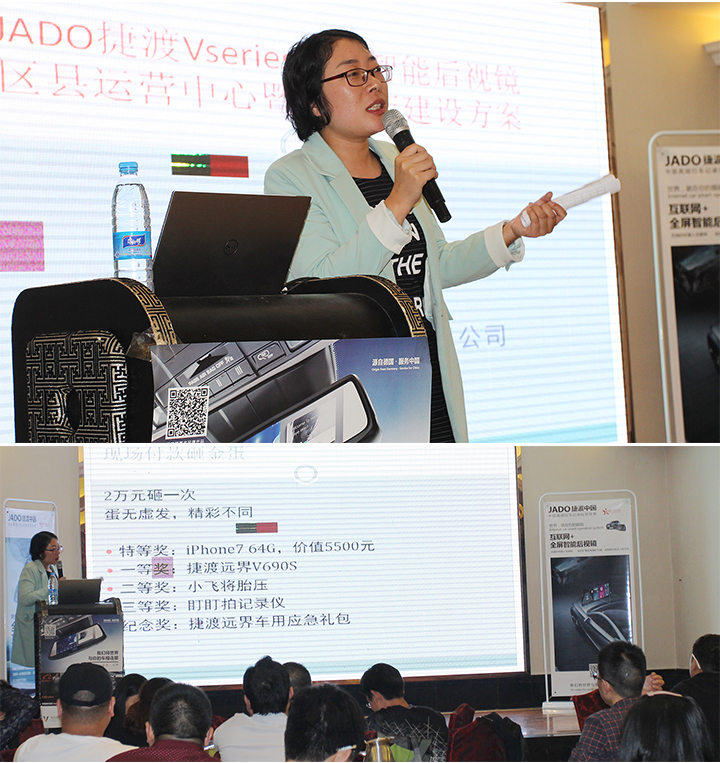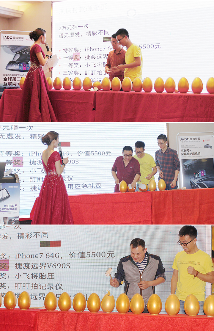 會上,主辦方盛東方為大家準(zhǔn)備了精彩爆場的砸金蛋活動,并由客戶按照下單順序依次砸蛋,其中特等獎為iPhone7,一共5個,iPhone7雖未上市,但是盛東方彭總有言在先,只要砸中特等獎的客戶絕對是iPhone7發(fā)售之后的第一批用戶。同時,還有遠界系列V690S、小飛將胎壓、盯盯拍、捷渡遠界車用大禮包等產(chǎn)品等大家砸蛋開獎。