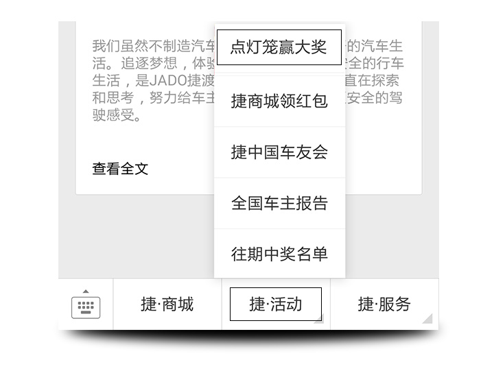 JADO捷渡中國 官方微信商城代金券一張 【參與方式】 請關(guān)注并打開公眾號捷渡中國 回復(fù)關(guān)鍵詞燈籠參與活動 也可以點擊捷渡中國公眾號菜單鍵 捷·活動—點燈籠贏大獎參與活動